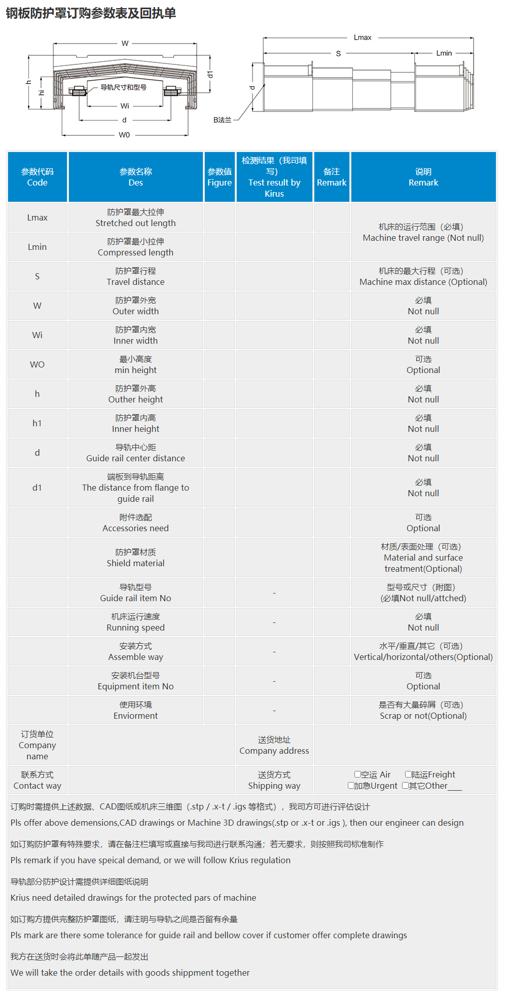 介绍:钢板防护罩技术参数示意图:钢板防护罩订购参数表及回执单: